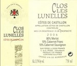 Ce vin porte encore la mention "Côtes de Castillon" car le changement en "Castillon Côtes de Bordeaux" n'est apparu qu'en 2009. Sur un terroir argilo-calcaire dans le prolongement du plateau calcaire de Saint-Emilion, les 8Ha du Clos Les Lunelles ont plus de 45 ans. Le vin a été vinifié en cuves béton puis a été élevé 6 mois sur lies fines en barriques neuves ou d'un vin. Il est complexe sur les fruits rouges, les épices et la réglisse, avec une finale mentholée."